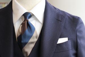 少し明るめのネイビーなのでネクタイも少し明るめの配色の物をチョイスしました。