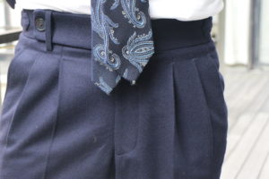 パンツの仕様はお互いサルトリアサルトリア仕様で持ち出しを長くし1本だけベルトループをつけた仕様にしました。