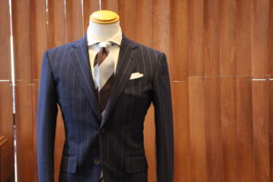 ネイビーベースにブラウンのチョークストライプ。